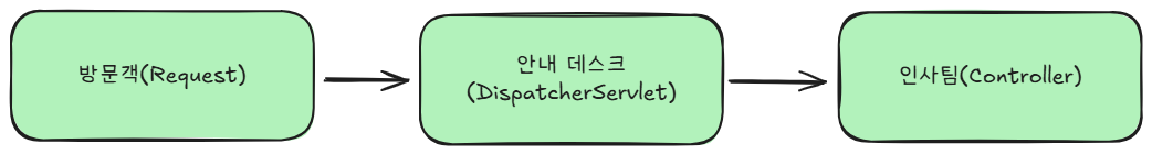 큰 회사의 안내 데스크를 떠올려 보세요. 방문객이 오면 안내 데스크에서 먼저 접수를 받습니다. 방문객이 "인사팀을 찾아왔어요"라고 하면, 안내 데스크 직원이 인사팀이 몇 층 몇 호인지 찾아서 안내해줍니다. DispatcherServlet이 바로 이 안내 데스크 역할입니다.