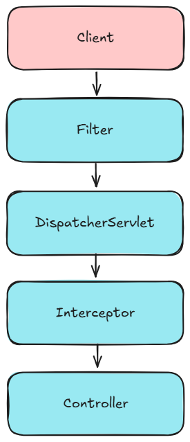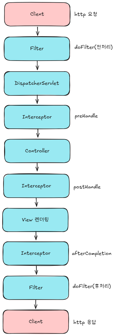 이 흐름을 보면 감이 올 겁니다. Filter가 먼저 실행되고, 그 다음에 Spring 영역으로 들어와서 Interceptor가 실행됩니다.